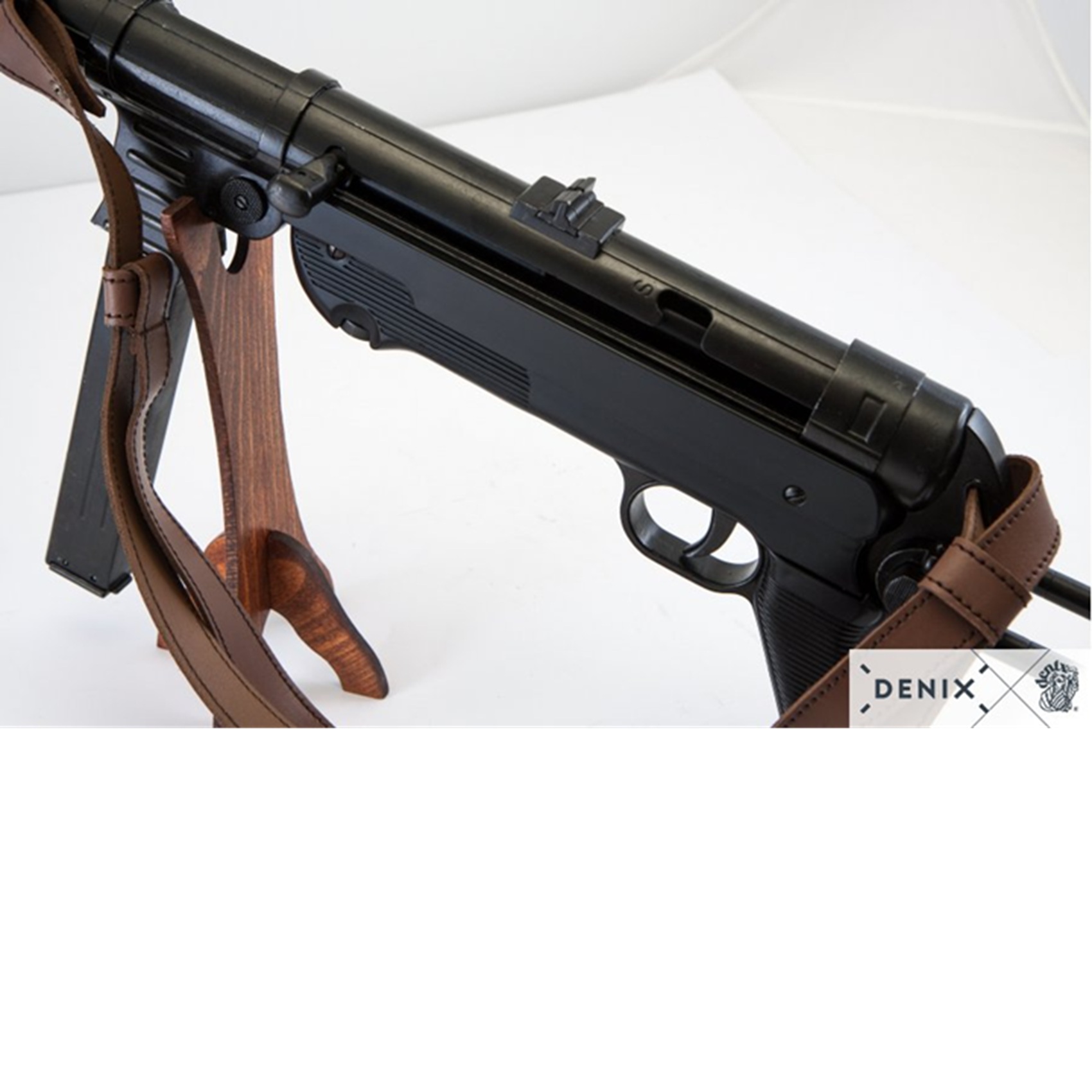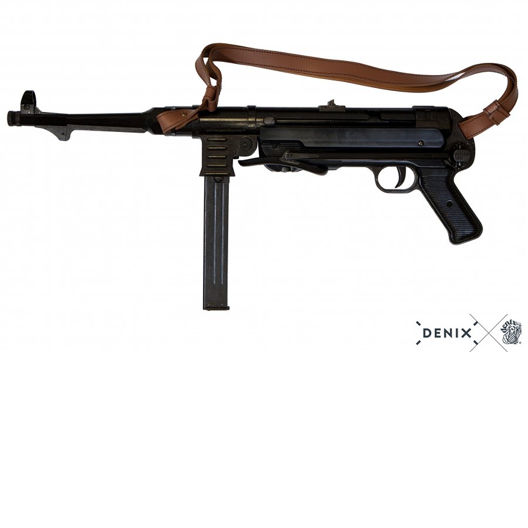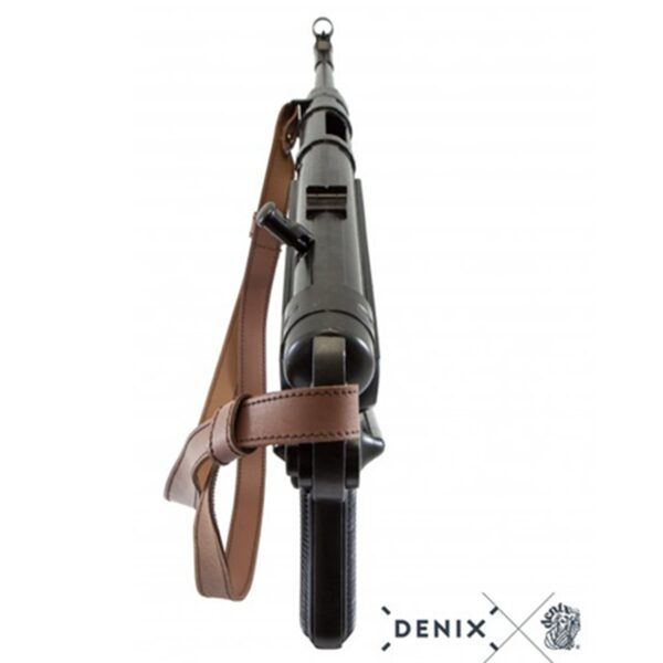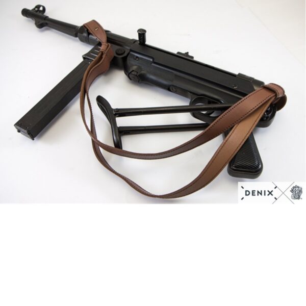 Reproducción de subfusil, fabricado en metal y plástico, con mecanismo simulador de carga y disparo, cargador extraíble y correa de piel ajustable.